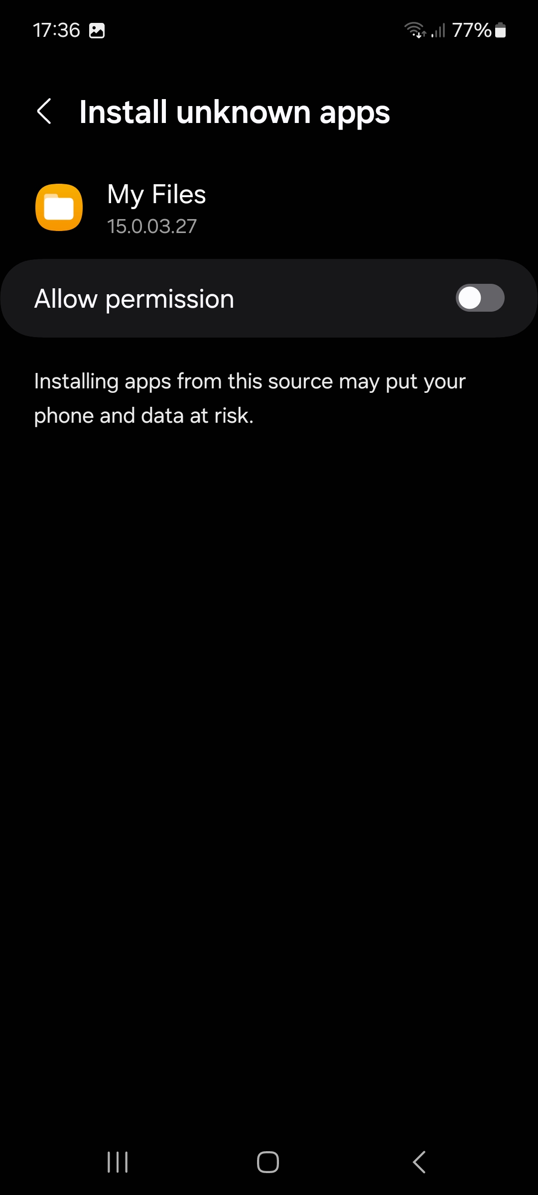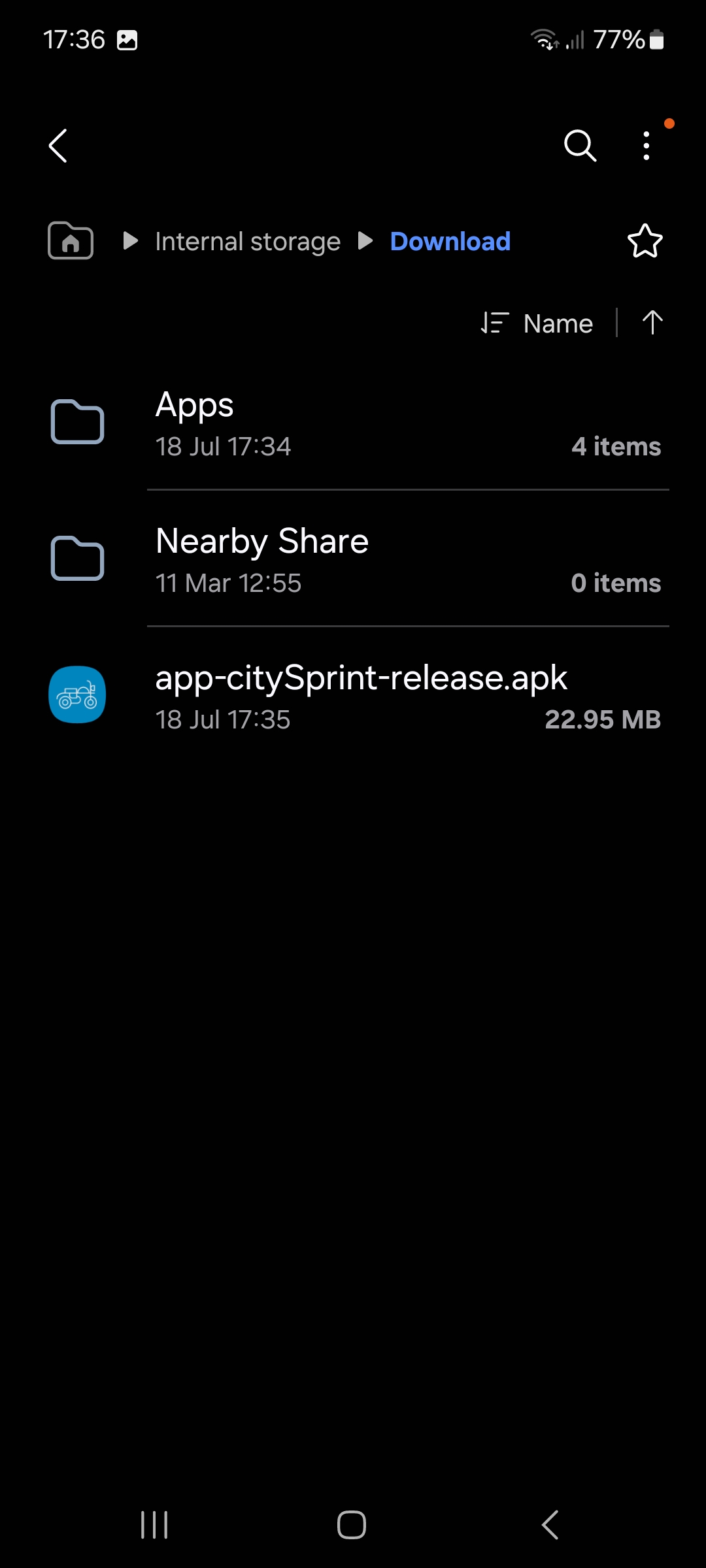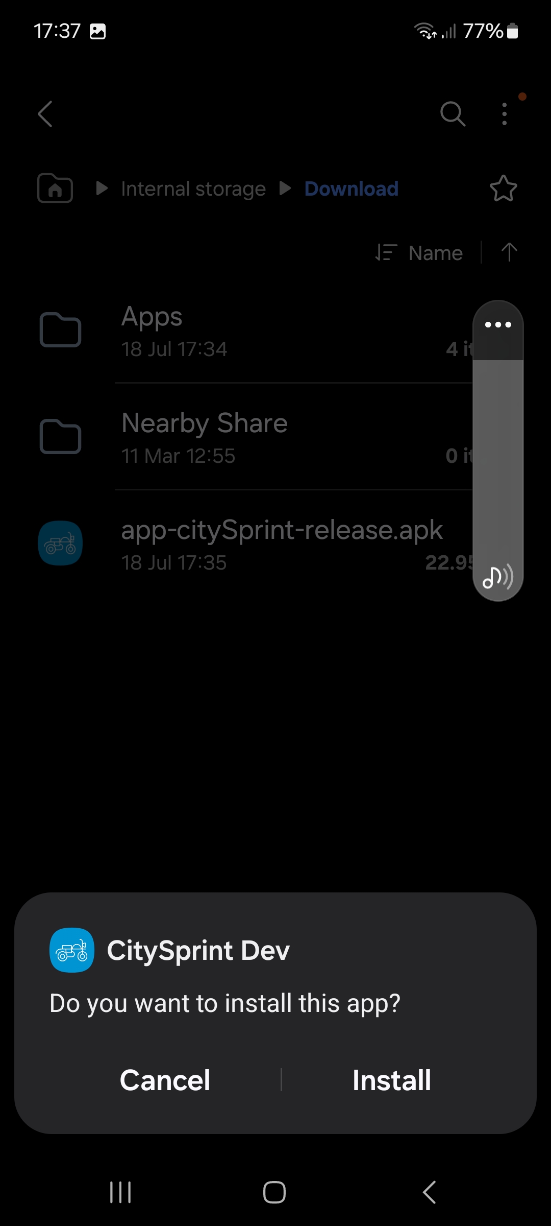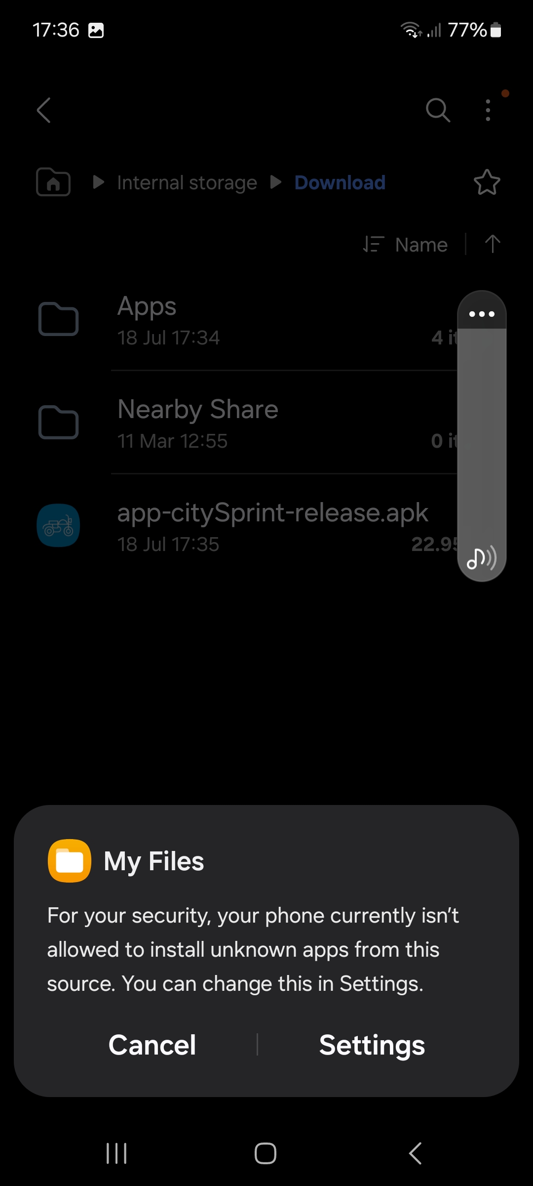 Select the app-citySprint-release.apk file. This will bring up a prompt that unknown applications are unable to be installed.