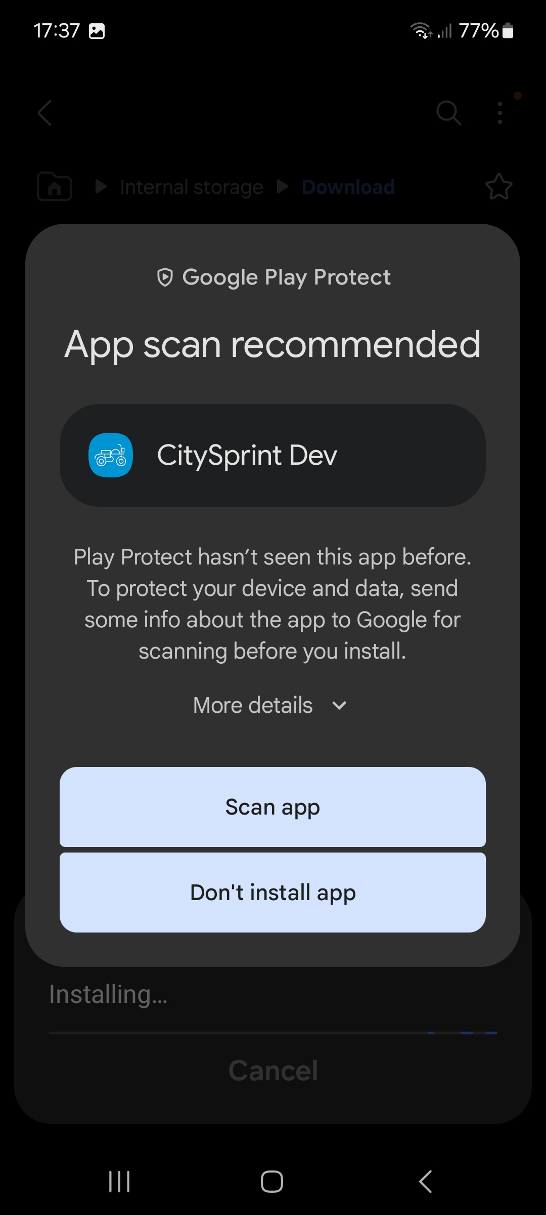 A warning may appear about play protect, select More details. (this warning appears because the courier app is not in the google play store.)